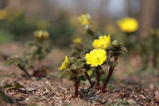 복수초는 노란 꽃이 일렬로 피어 눈부신 봄 풍경을 만듭니다. 추위를 이겨내는 강인한 생명력이 돋보입니다.