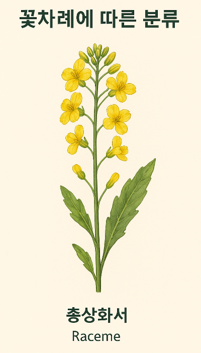 | 무한꽃차례 | 총상꽃차례 | 꽃자루 있음, 아래→위 개화 | 유채 |